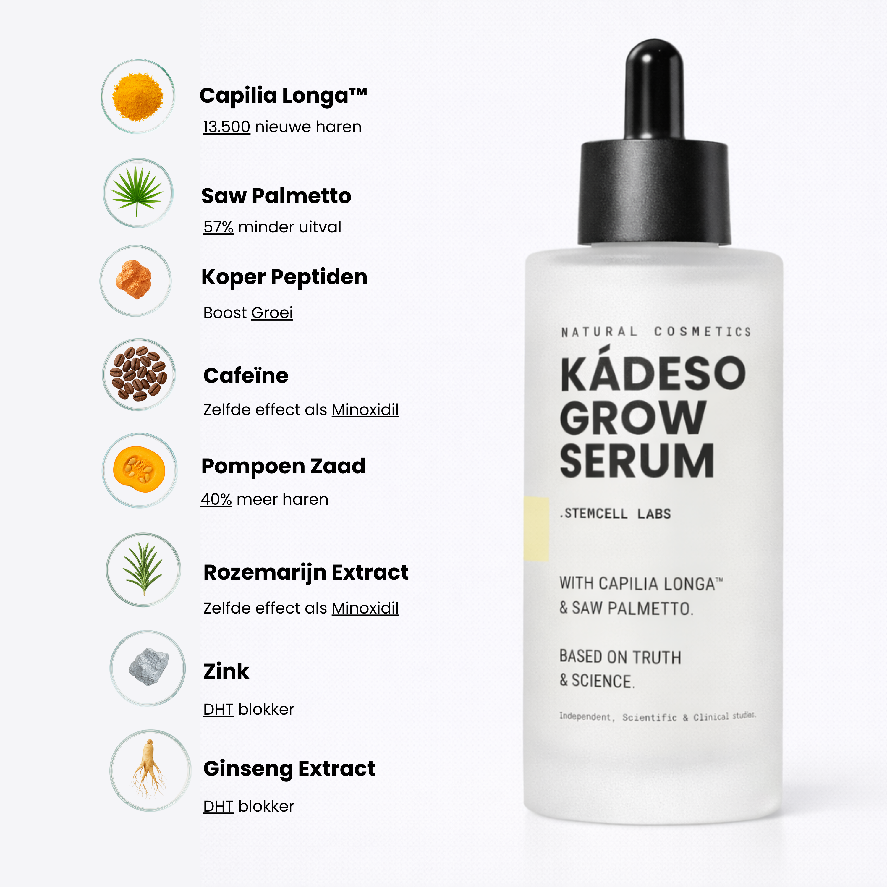 De gepatenteerde stamcellen en natuurlijke DHT-blokkers van KÁDESO helpen bij alle soorten haaruitval. Ze zorgen ervoor dat je haar weer dikker wordt, door je hoofdhuid sterker en gezonder te maken. Je hoeft het maar 30 seconden per dag te gebruiken.