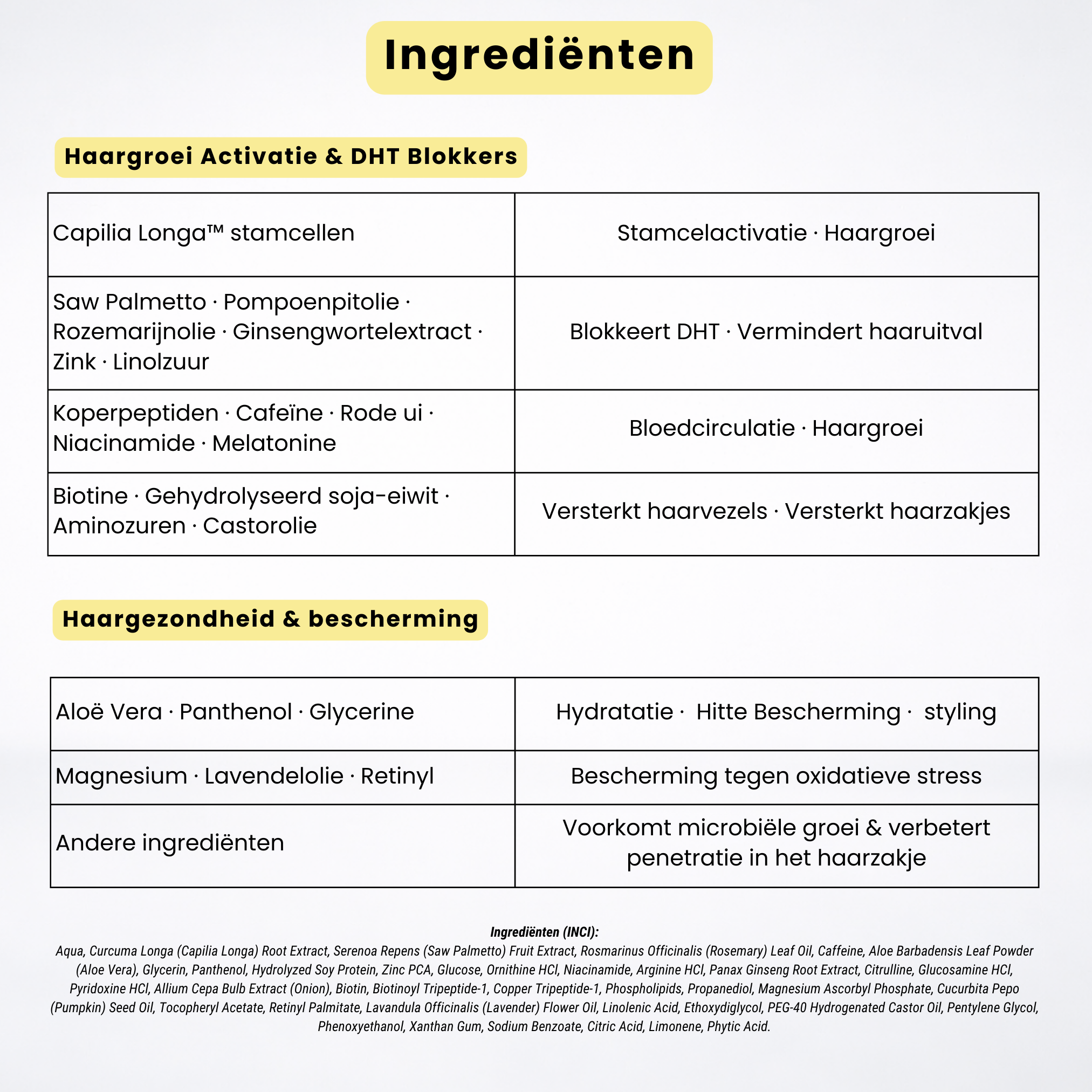 Curcuma Longa (Capilia Longa) Wortelextract, Serenoa Repens (Saw Palmetto) Vruchtextract, Rosmarinus Officinalis (Rozemarijn) Bladolie, Cafeïne, Aloe Barbadensis Bladpoeder (Aloë Vera), Glycerine, Panthenol, Gehydrolyseerd Sojaproteïne, Zink PCA, Glucose, Ornithine HCl, Niacinamide, Arginine HCl, Panax Ginseng Wortelextract, Citrulline, Glucosamine HCl, Pyridoxine HCl, Allium Cepa Bolextract (Ui), Biotine, Biotinoyl Tripeptide-1, Koper Tripeptide-1, Fosfolipiden, Propaandiol, Magnesium Ascorbyl Fosfaat, Cucurbita Pepo (Pompoen) Zaadolie, Tocopheryl Acetaat, Retinyl Palmitaat, Lavandula Officinalis (Lavendel) Bloemextract, Linoleenzuur, Ethoxydiglycol, PEG-40 Gehydrogeneerde Casterolie, Pentyleen Glycol, Fenoxyethanol, Xanthaangom, Natriumbenzoaat, Citroenzuur, Limoneen, Fytinezuur.